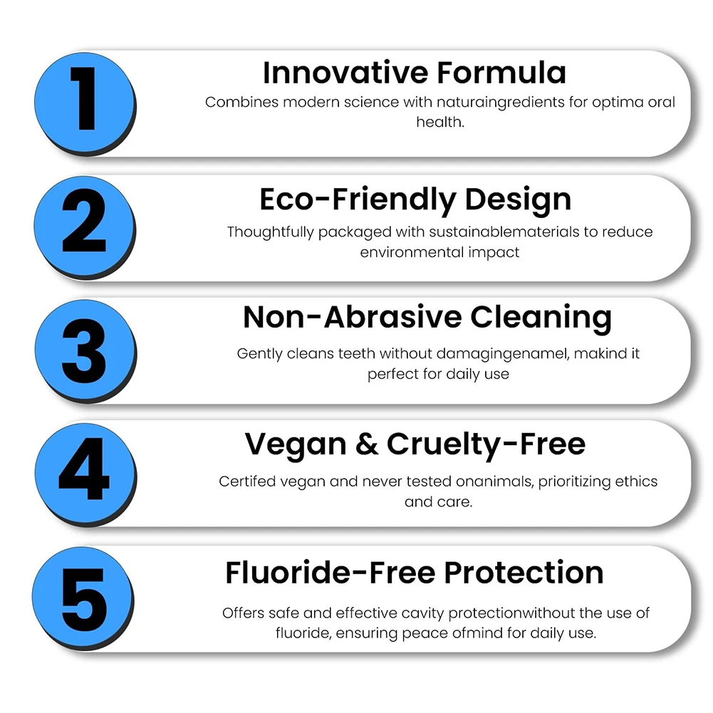 Efficient and Safe Fluoride-Free Formulas: Enjoy the-benefits of our Toothpaste that offers advanced enamel protection without fluoride, ensuring a safe and effective cleaning experience for your teeth.