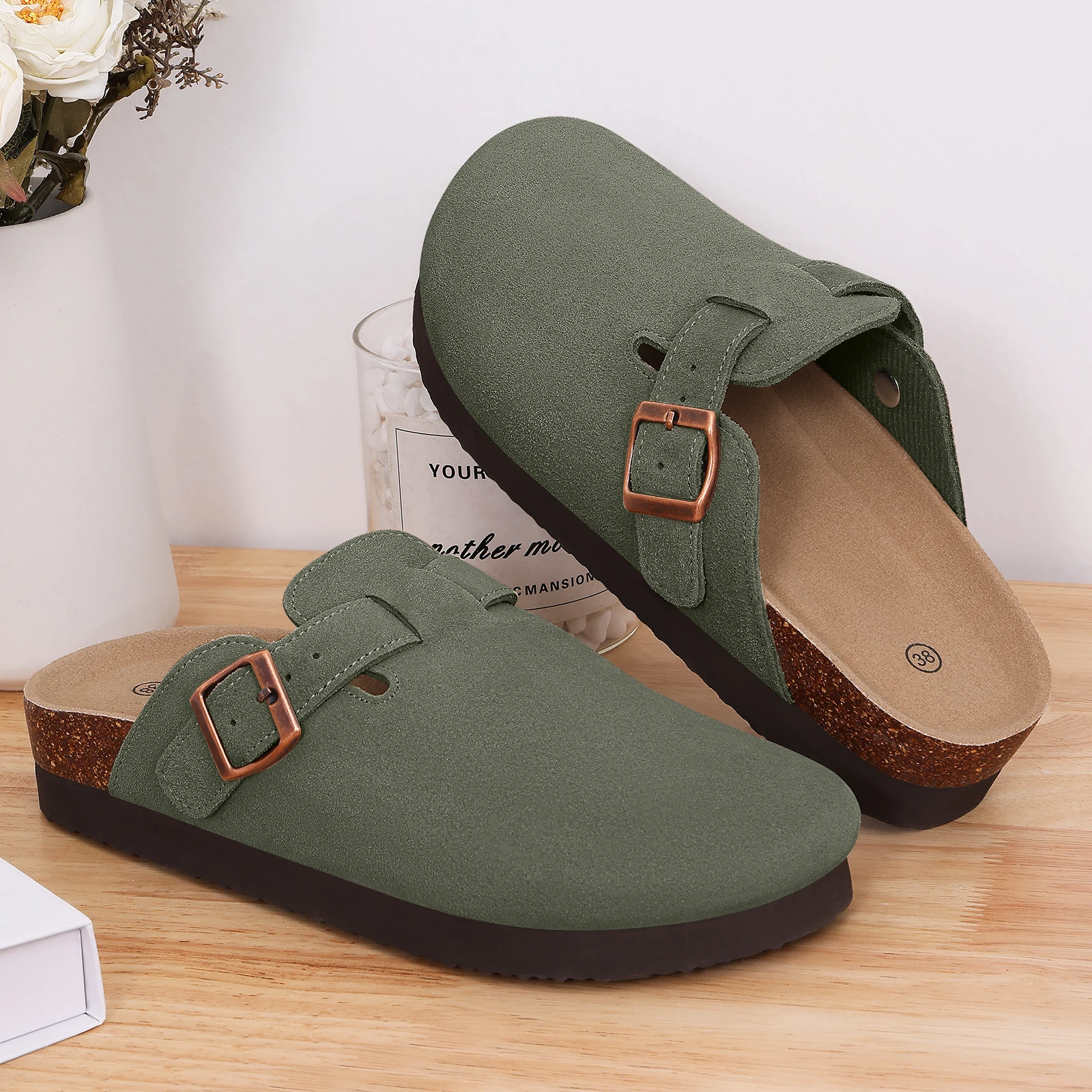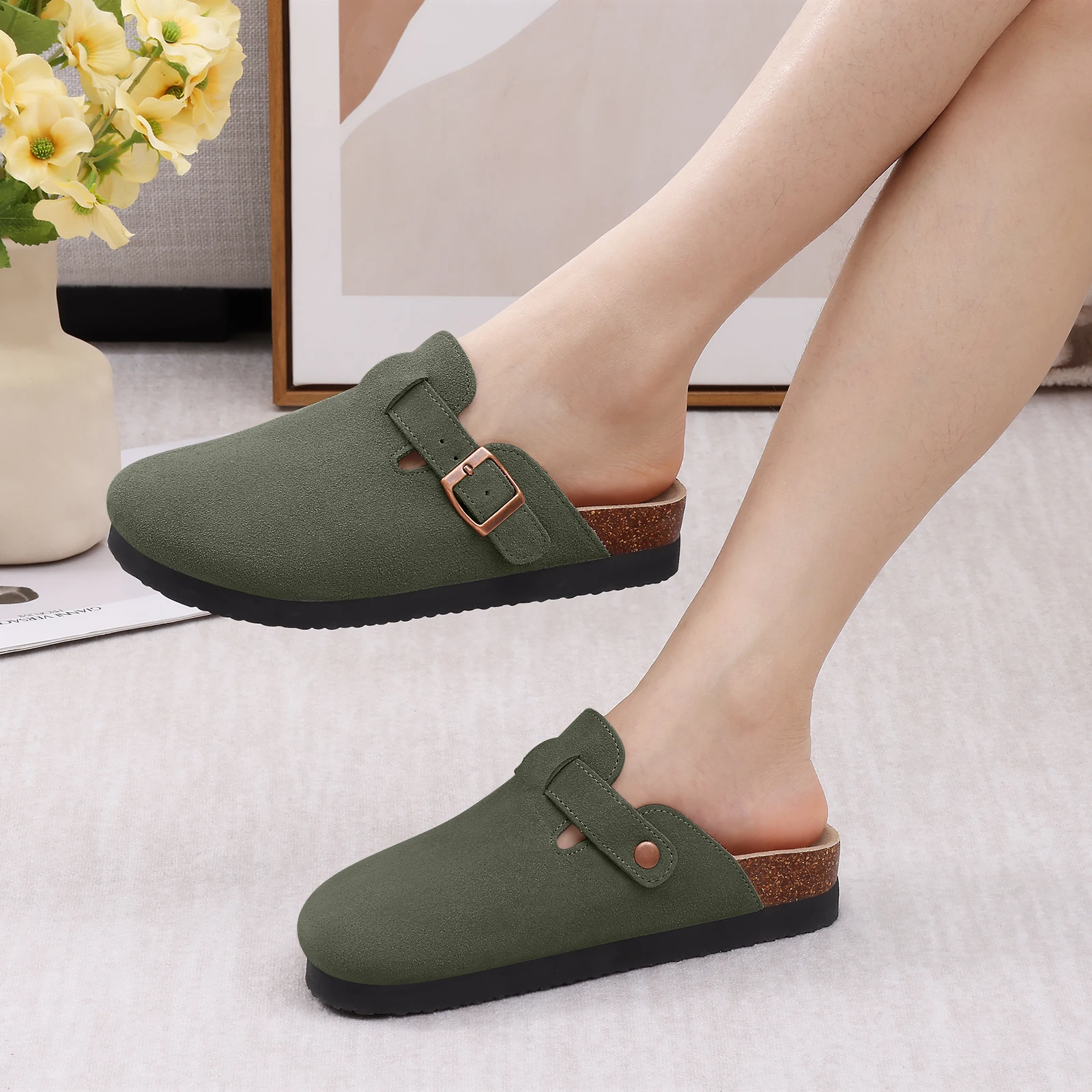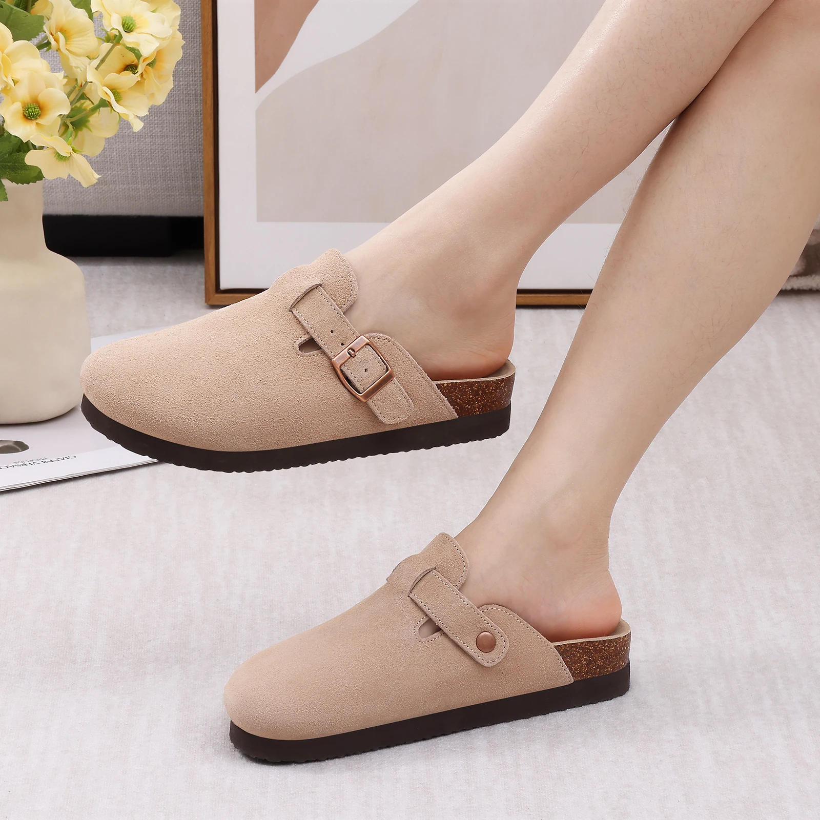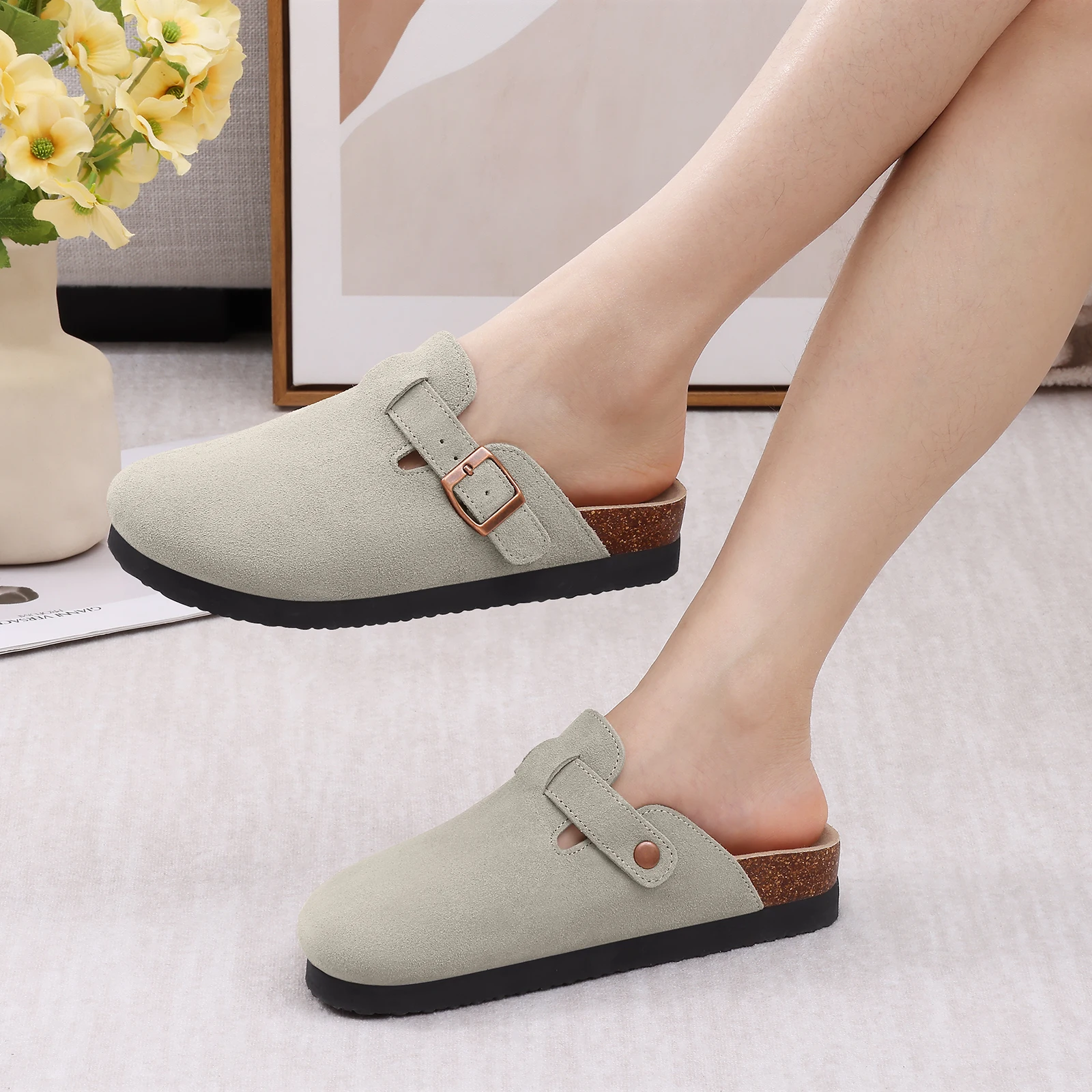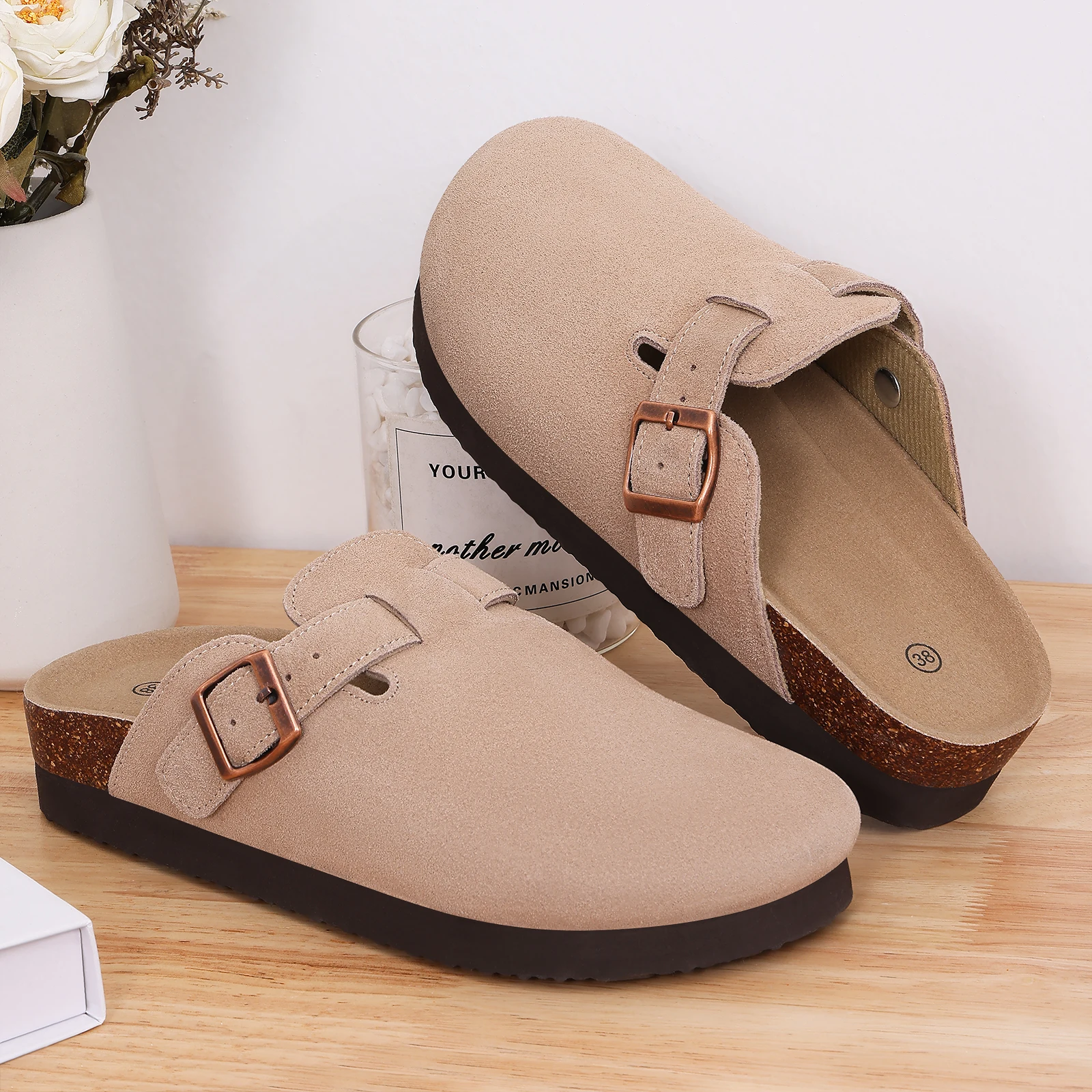 Smile Pop Men's Suede Shoes With Adjustable Back Strap Leather Mules With Cork Flip-Flop Slippers Insoles Slip-On Potato Shoes