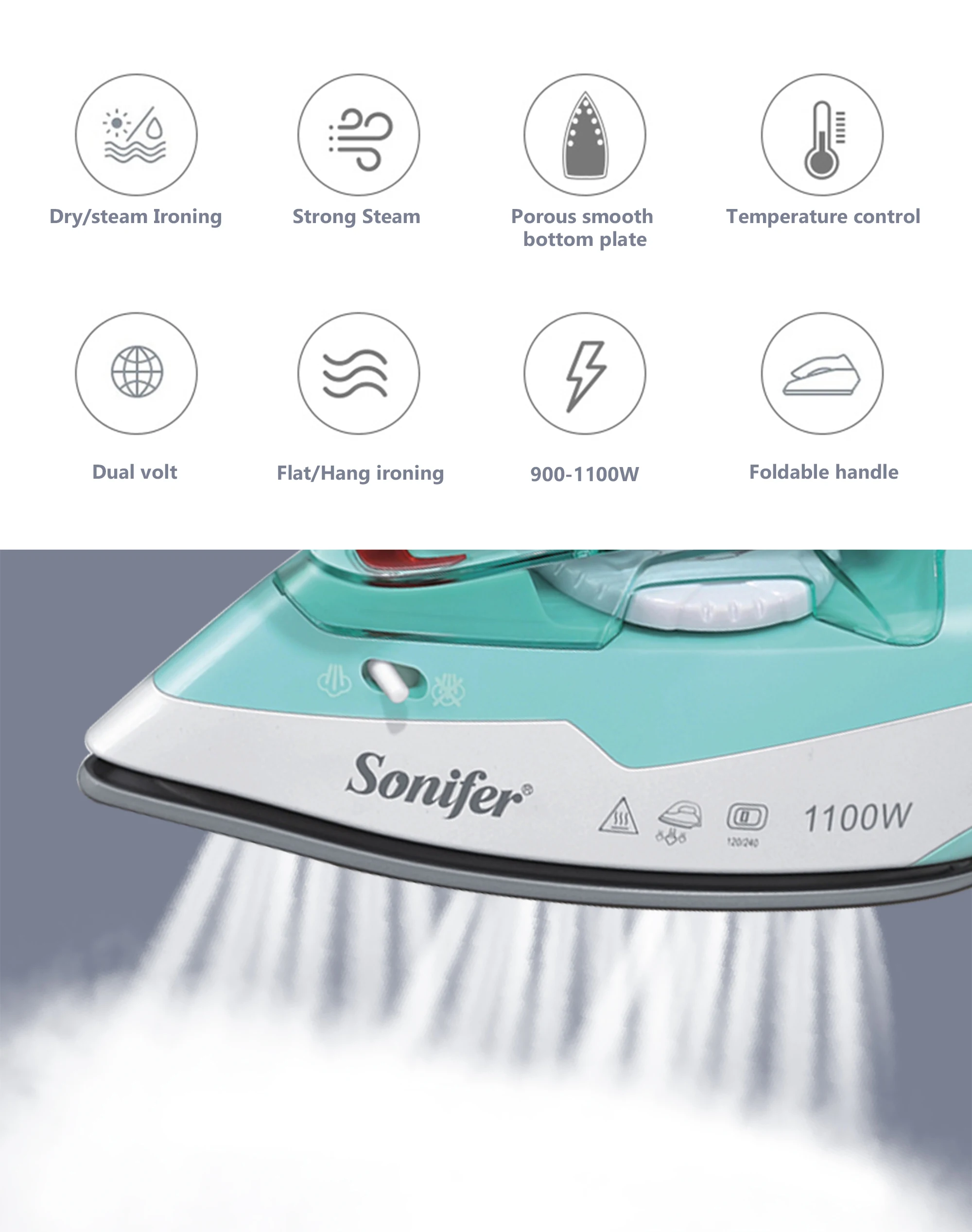 Steam Iron portable Foldable handle 1100W Household Fabric Electric Iron Ceramic soleplate Fast-Heat For Clothes Ironing Sonifer